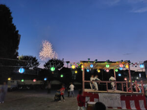 毎年、すぐ近くにある富士森公園の花火大会と同日に開催されるため、花火を見ながら盆踊りを踊れるという絶好のロケーションで踊ることができます。